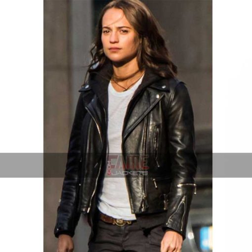 Women’s Black Slim Fit Leather Biker Jacket worn by famous Swedish actress Alicia Vikander in an action movie Tom Raider. She played a role as Lara Croft . She was born on 3rd October 1988 and started her acting career by appearing in short films and dramas.