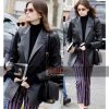 This women’s black leather blazer has a fancy look and can be easily wear as casuals or formals. It’s original material is real sheepskin but also available in many other materials like cowhide, suede & faux. This Kaia Gerber blazer comes with stylish buttoned closure, lapel style collar and long sleeves. You can also get this blazer in many other colors as per your own choice.