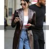 Kendall Jenner Brown Leather Knee Length Winter Coat For Women
