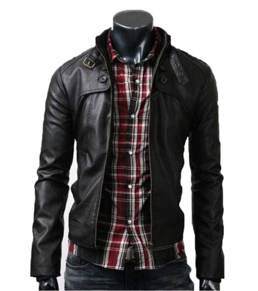 This stylish belted collar jacket for men is a black leather jacket at $50 off sale.