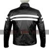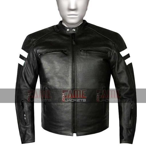 This men’s black motorcycle leather jacket with white stripes has style and elegance together. It’s original color is black and comes with stylish zipper front closure, collar with buttons, full sleeves with zipper cuffs and 2 zipper pockets. It also has external zipper pockets, internal pockets and viscose lining inside. We make this black leather jacket with lambskin, cowhide, faux and suede material. Also many other colors are available other than black. You can choose and order your favorite design retro motorcycle jacket in your favorite material and color.