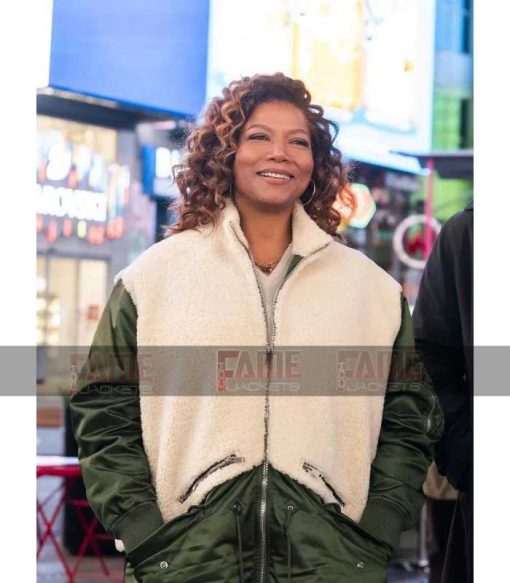 This green and white women winter shearling coat has worn by Queen Latifah who is famous singer, song writer and actress. This women shearling coat is available only in Actual material and color. Its real price is $296.99 but now in sale it is in just $156.99.
