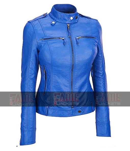 Womens Blue Sheep Leather Slim Fit Motorcycle Jacket SaleĀ