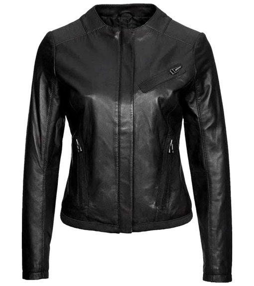 FameJackets.com now presents a spectacular black collarless leather jacket that women cannot stay to have it. Consequently this most recent inspiration ideally suits the tasteful girls who desire to get themselves noticed after wearing it.