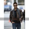 He has worn this brown distressed leather jacket and looks very hot and handsome. It comes in Lambskin and Cowhide Leather. It has front zipper closure, pockets externally and internally.